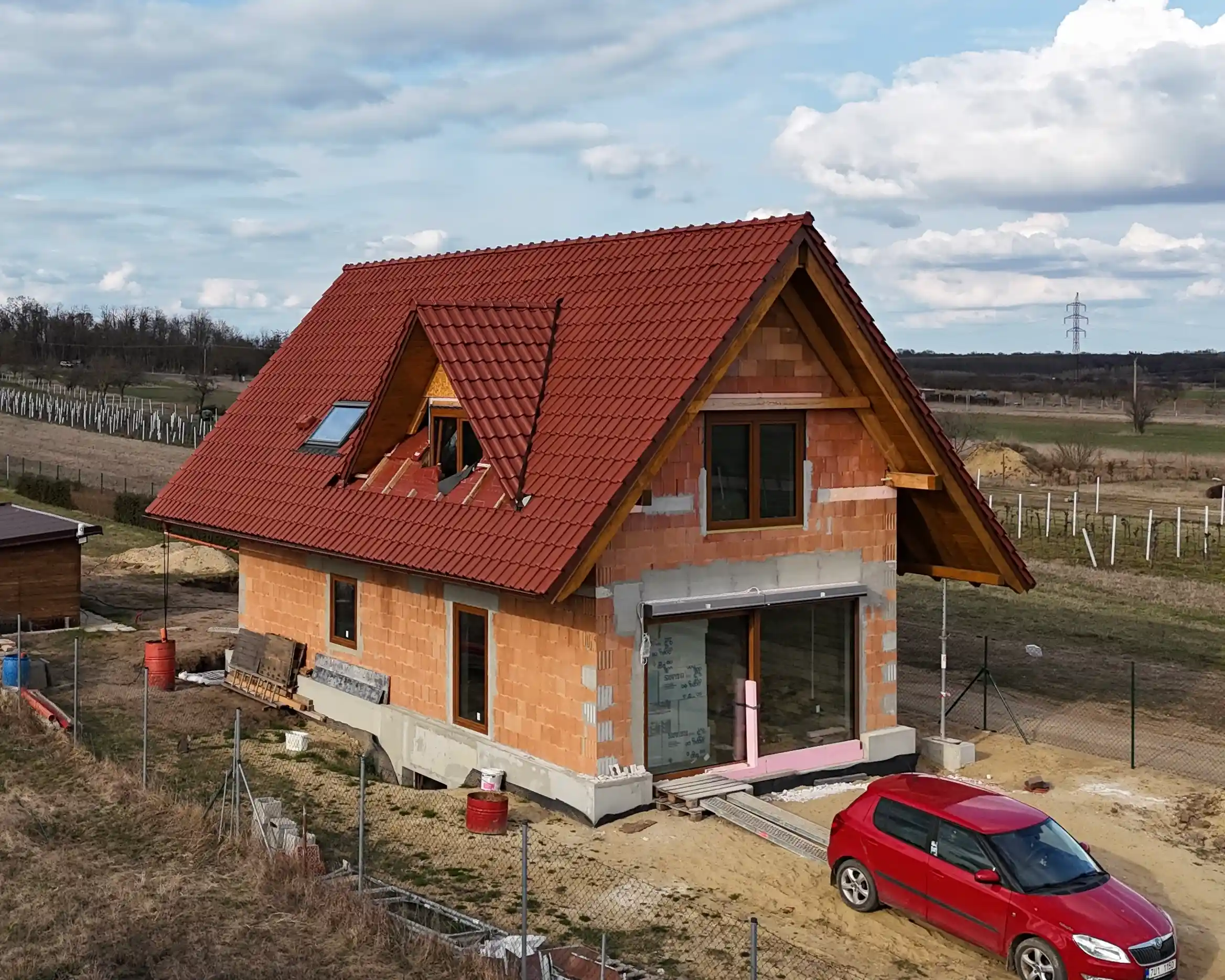 • Exterieur: Die traditionelle Silhouette des Hauses wird durch moderne Dachelemente und Fenster ergänzt, die das zukünftige Dachgeschoss beleuchten und dem Gebäude einen zeitgemäßen Ausdruck verleihen.